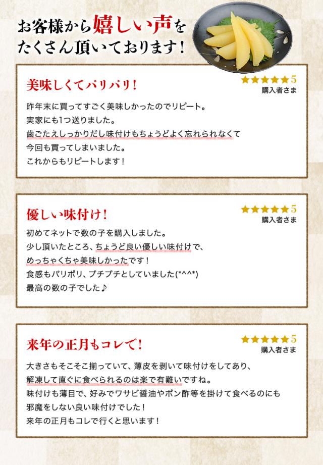 - 数の子楽しみに待ってます。おいしかったら来年もリピ買いしたいと思います