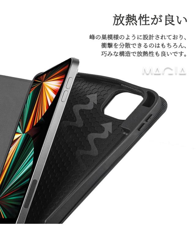 裏側には柔軟ハニカム3D構造を採用しており、放熱性に優れて、電池寿命を延長されます。外側は高級PUレザーで、ipad に合わせた作り、全面保護、耐摩耗性 傷つき防止します。穴は特別に加工されて、iPadの電源ボタンと音量ボタンもしっかり保護します。