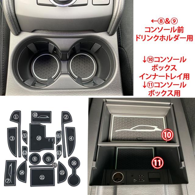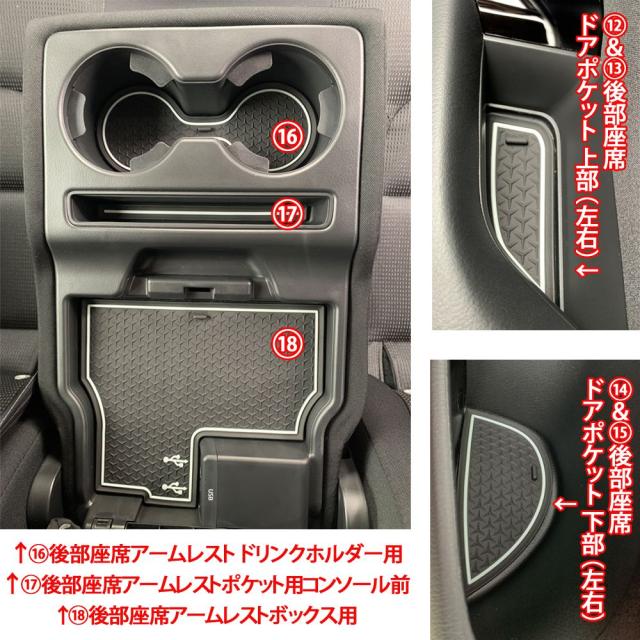 (1,2)前席ドアドリンクホルダー用×2(左右) (3,4)前席ドアポケット用 下部×2(左右) (5,6)前席ドアポケット用 上部×2(左右) (7)フロントトレイ用×1 (8,9)コンソール前ドリンクホルダー×2 (10)コンソールボックス インナートレイ用×1 (11)コンソールボックス用×1 (12,13)後部座席ドアポケット 上部×2(左右) (14,15)後部座席ドアポケット 下部×2(左右) (16)後部座席アームレスト ドリンクホルダー用×1 (17)後部座席アームレストポケット用×1 (18)後部座席アームレストボックス用×1 |