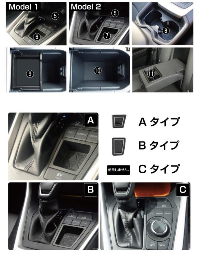 (1)助手席オープントレイ用×1 (2)運転席オープントレイ用×1 (3)フロントドアポケット(運転席,助手席)×2 (4)リアドアポケット(運転席,助手席)×2 (5)センターオープントレイ用×1 (6)シフトトレイ用(プッシュ式 ハイブリッド車用)×1 (7)シフトトレイ用(プッシュ式 非ハイブリッド車用)×1 (8)フロントカップホルダー用×1 (9)センターコンソールボックス インナートレイ用×1 (10)センターコンソールボックス用×1 (11)リアカップホルダー用×1 |