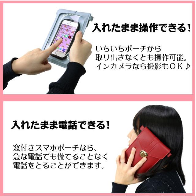 ・透明窓付きのショルダースマートフォンポーチです。 ・窓が大きめなので多機種に対応! ・入れたまま操作できるのはもちろん、電話や音楽を聴くことも可能。 ・仕切りがあるのでスマホだけでなく小物なども収納できます。 |