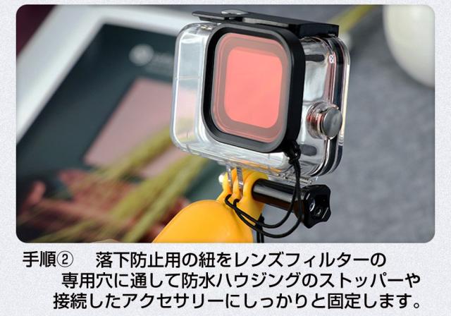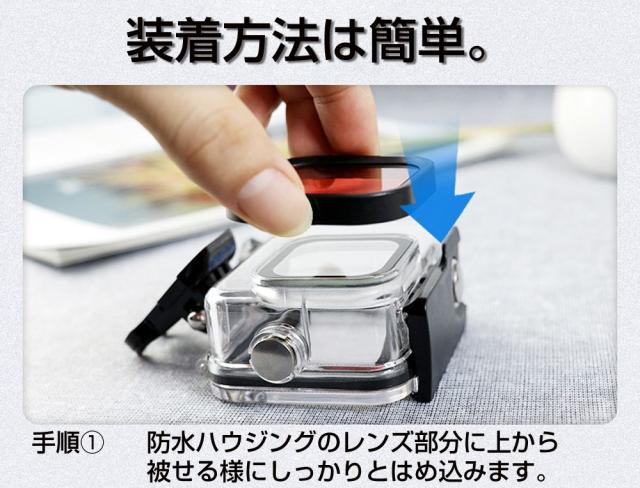 ※使用には別売の防水ハウジングが必要です。 ※画像で使用している機器本体や防水ハウジング等は本製品には付属しておりません。 ※装着撮影例はイメージです。フィルターの効果は実際の撮影環境等により異なります。 ※本製品の使用、または故障等によって生じたいかなる事故や直接・間接の損害、機器及び設備・機材等の故障について、弊社ではその一切の責を負いかねます。予めご了承ください。 |
