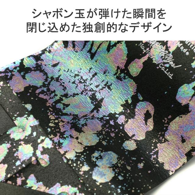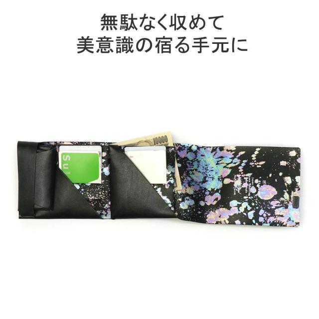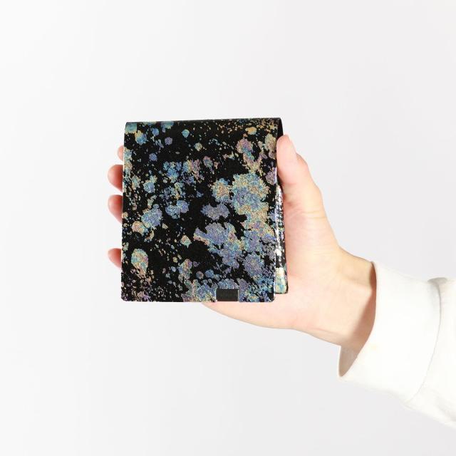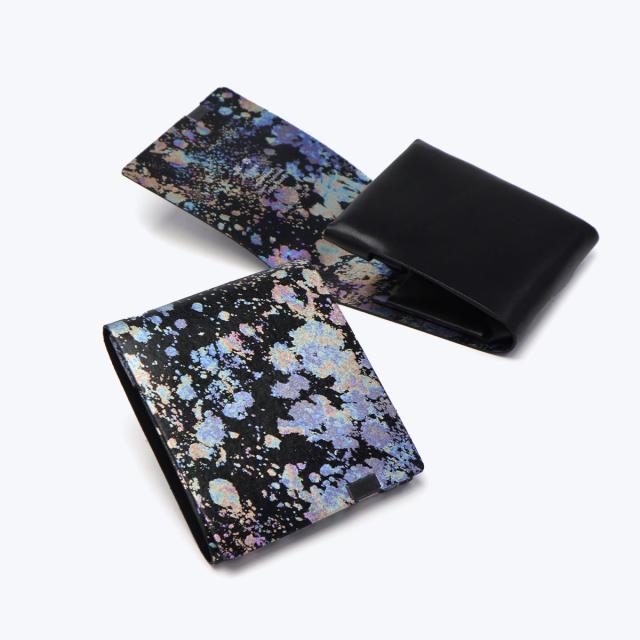 上質なブラックレザーに、まるでシャボンの雫が飛び散ったかのような箔を乗せ、幻想的な表情に仕上げた三つ折り財布。贈答品を包む「袱紗(ふくさ)」をモチーフにし、上質な一枚革を折って成形。縫わずに最後に1点をボルト&ナットで留め付けるだけという、日本の美学が表現されたデザインです。ファスナーやボタンを使わず、レザー本来の風合いを最大限に活かしています。