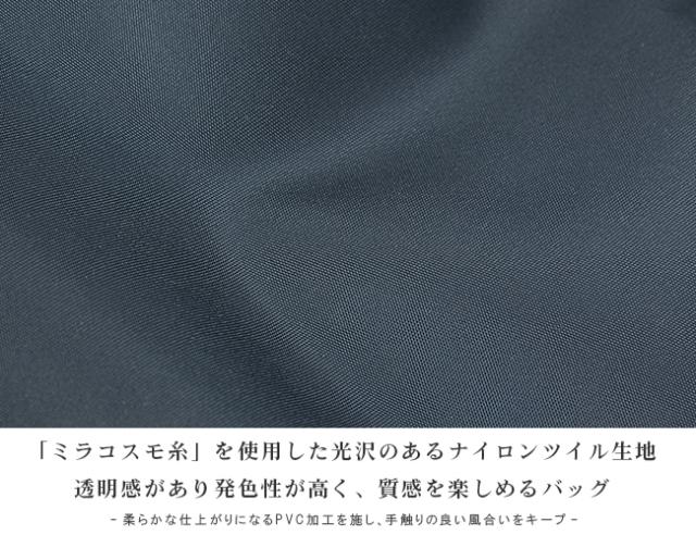 メイン素材のナイロンツイル生地には透明感と光沢のあるミラコスモ糸を使用しています。生地の裏面には柔らかな仕上がりになるPVC加工を施すことで、手触りの良い風合いをキープしつつも水滴が中に染み込みにくくしました。