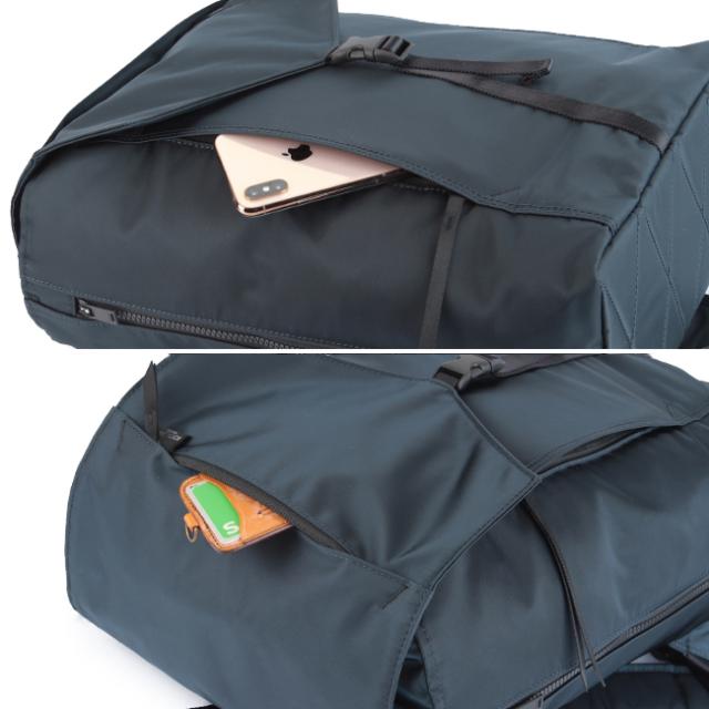 フラップ部分と、フロント部分にファスナーポケットが備わっています。