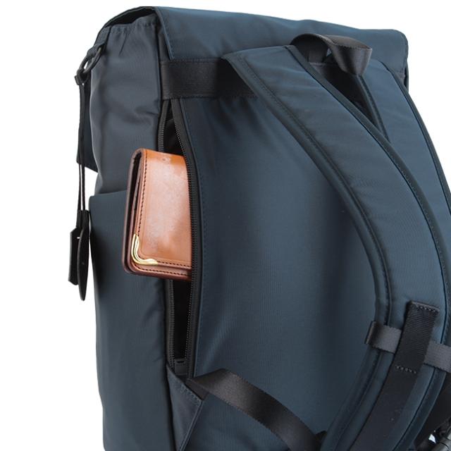 背面には財布などを収納しやすいファスナーポケットも備わっています。