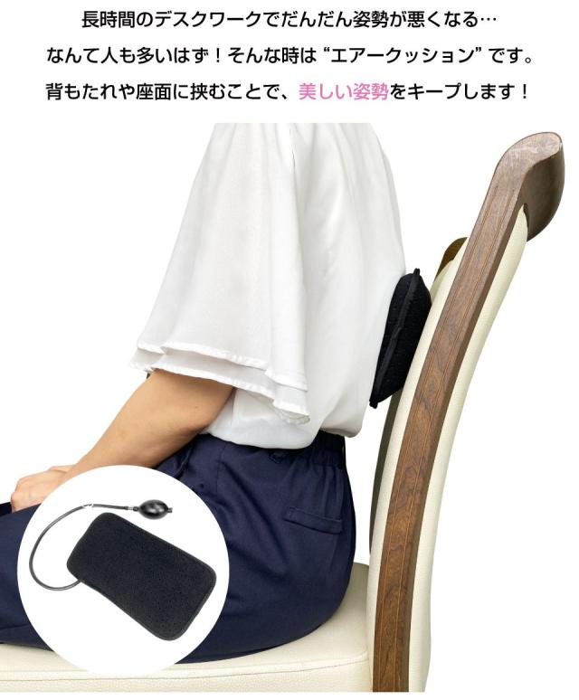 ・猫背や良い姿勢に効果的なエアークッションです。 ・長時間のデスクワークや車の運転で、姿勢が悪くなる方にオススメです! ・背もたれや座面など、気になる場所に挟んで美しい姿勢をキープできます。 ・ポンプで空気圧を調整可能。裏面はマジックテープなので、貼り付けて使用できます。 ・肌触りの良い素材は腰の痛みを和らげてくれます。 |