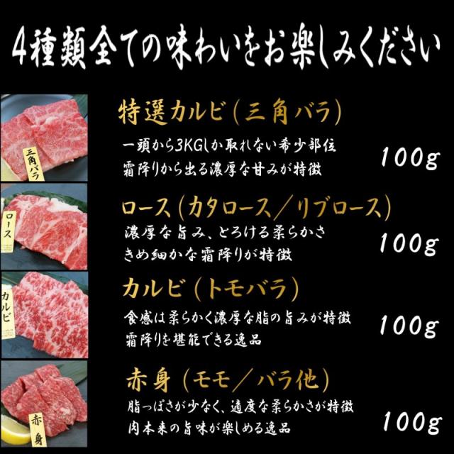 黒毛和牛 A4 A5ランク 焼肉4点セット 特選カルビ(三角バラ)、ロース、赤身、カルビの4種類
