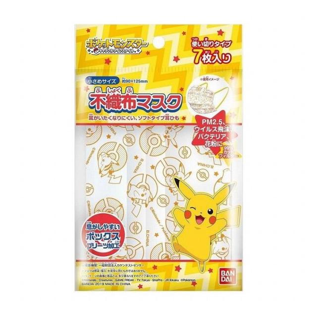 ポケットモンスターの子供用不織布マスク。お買い得感のある7枚入り!耳が痛くなりにくいソフトタイプの耳ひもです。息がしやすいボックスプリーツ仕様。ほこりなど99%カットフィルター採用。