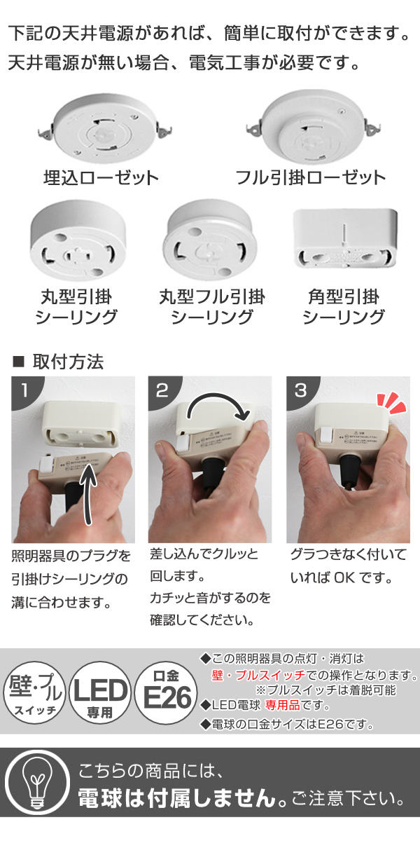 | 注意事項 | 【対応電球】 E26/15Wまで(4個) ※LED電球専用 ※電球は付属しません。 ※ダクトレールへの取り付けはできません。 【取付方法】 引っ掛けシーリング |
