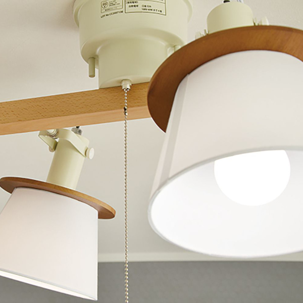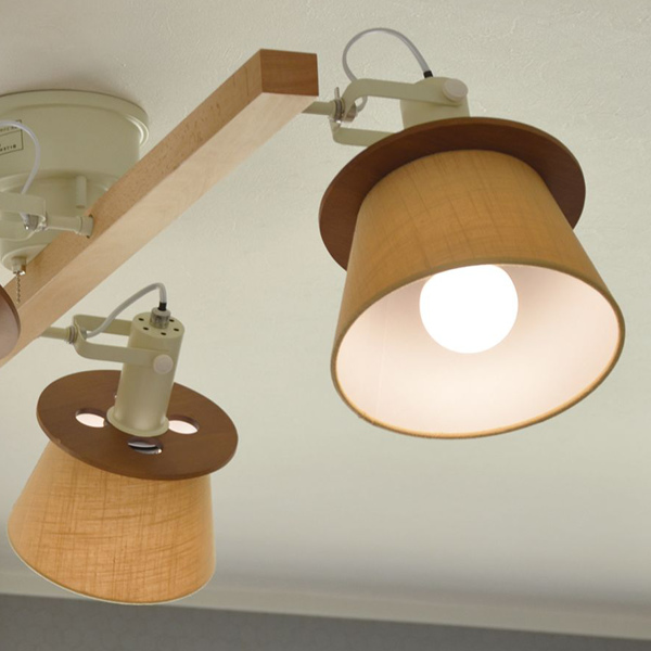 ナチュラル素材を使用したシーリングライトです。フレンジやソケット部分のホワイトスチールと、木目、ファブリックのやさしい雰囲気が、暖かみある空間を作り出します。4灯が1列に並んだ存在感あるデザインは、空間のアクセントとなり、お部屋のセンスをアップさせます。