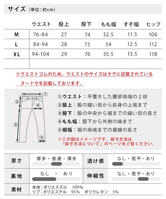 | パンツ・サイズ | ウエスト | 股上 | 股下 | もも幅 | 裾幅 | ヒップ |