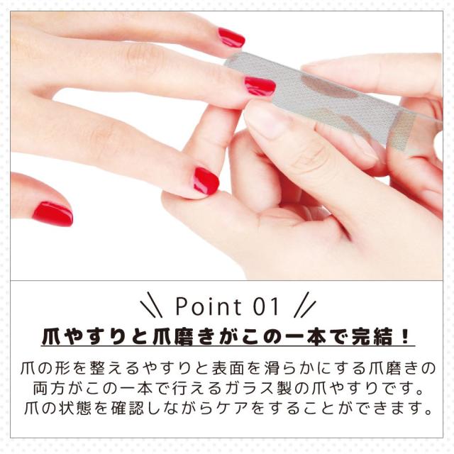 ・爪やすりと爪磨きの両方がこれ一本で完結する便利なガラス製の爪やすりです。 ・透明なので爪の状態を簡単に把握しながらケアができます。 ・収納ケース付きなので置き場所に困らず持ち運びも簡単です。 ・紙製のやすりと異なりガラス製は使用後のケアをしていただくことで長く使うことができます。 |