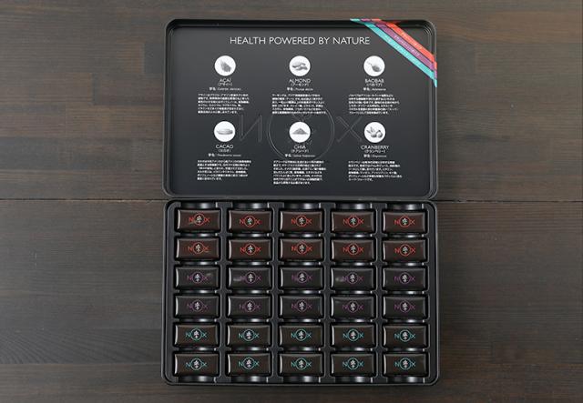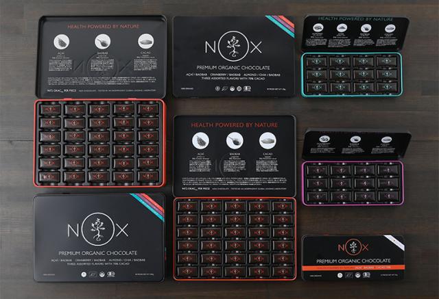 ノックス(NOX)のチョコレートは、トランス脂肪酸・乳製品・白糖を使用せず、 100%オーガニック原料だけで作られた上品な味わいが広がるダークチョコレートです。 カカオ70%含有のチョコレートは、ほろりと苦味を感じる味わいが特徴。 その中に話題の"スーパーフルーツ"を加えることで、ナチュラルでフルーティーな味わいをプラス。 甘くて美味しいチョコレートをサプリメント感覚で召し上がれます。 また、糖質制限をされている方や罪悪感なく甘いものを召し上がりたい方にも◎。 蓋を開けた瞬間、広がるチョコレートとバニラビーンズの上品な香りが食欲をそそられます。 ラインナップは全部で2種類あります。 それぞれアサイー、バオバブ、チアシードなどのスーパーフルーツが配合。 たっぷり入ったスウェーデン生まれの体に優しいチョコレートをご体感ください。 | |||||||||||||||||||||||||||||||||||||||||||||||||||||||||||||||||||||||||||