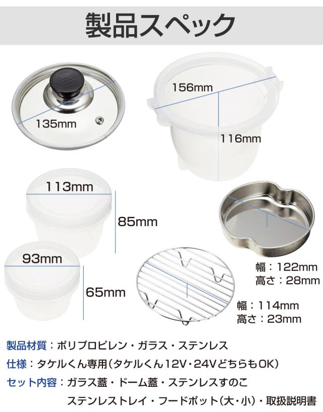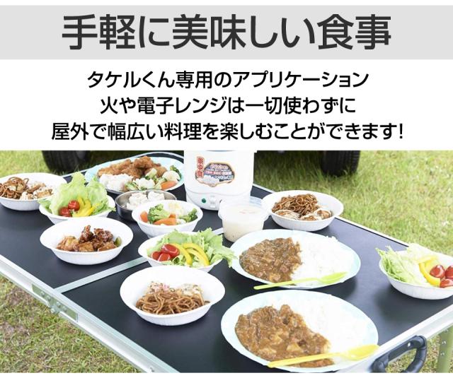 ・タケルくんが6倍パワーアップ!? ・別売のタケルくん(炊飯器)を6種類のアプリケーションで、様々な調理を可能にしたアイテムです。 ・車での旅行中、現地でしか味わえない美味しさがそこにはあります。 ・また自宅で作ったお弁当を車内で温めて食べる事も可能となりました。 ・アイデア次第で様々な用途にご活用いただけます。 ・レンジの代わりとしてご活用いただけます。 |