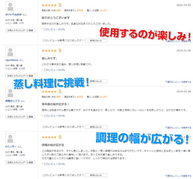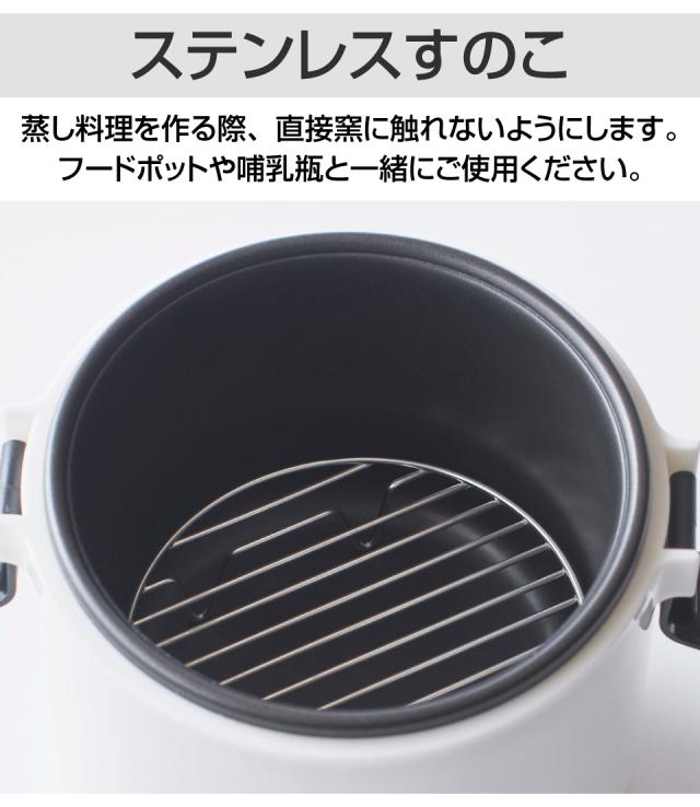 タケルくんのお釜にステンレストレイを敷いて軽量カップ半分の水を入れます。 その上にフードポットに入れた食材を2段まで載せて炊飯ボタンを押せば蒸気の力で「チン!」できます。 高さに合わせて蒸しフタを使い分けてください。 |