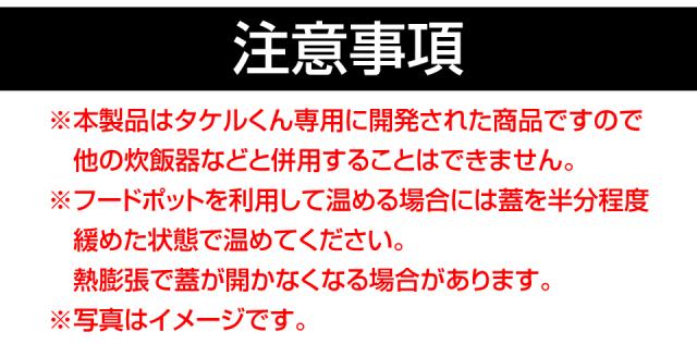 ●直流炊飯器 タケルくんは別売りです。 ●タケルくんは空焚きや長時間の連続使用を行うと故障の原因となります。 ※タイマー等が付いておりませんので必ず目の届く範囲で温めを行うようにしてください。 ※40分以上温めると水分が飛んでしまい美味しく温められない上、空焚きに近い状態となり故障の原因となりますのでお止め下さい。 ●温めの際は、フードポット(小)とフードポット(大)のフタを半分以上緩めた状態で温めてください。 ※膨張してフタが外れなくなる場合がございます。 |