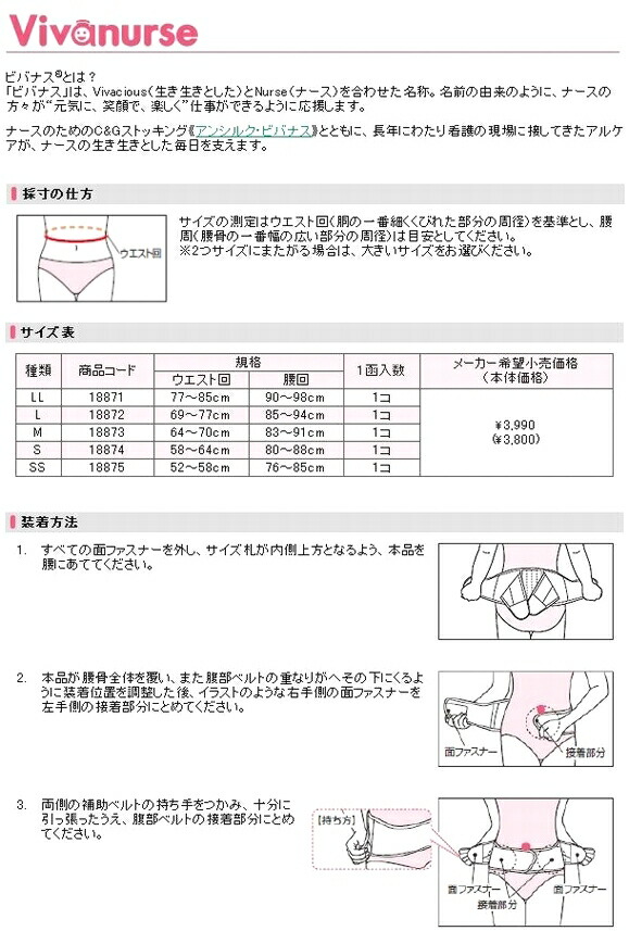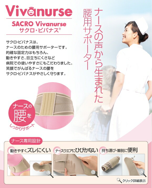 ※サイズのお間違いない様今一度ご確認下さい。 アルケア社は主に病院などに納品している医療福祉専門メーカーです。 サクロビバナスはナースの為の腰用サポーターです。 的確な固定力はもちろん、動きやすさ、めだちにくさなど、病院での使いやすさにもこだわりました。 笑顔でがんばるナースの腰をサクロビバナスがやさしく守ります。