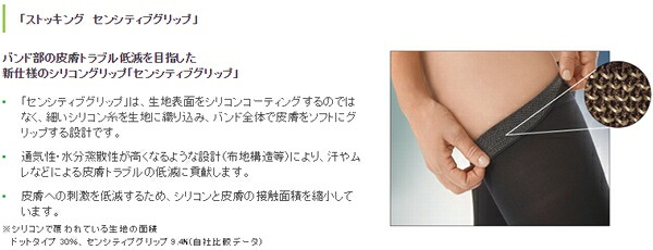 ※サイズのお間違いない様今一度ご確認下さい。 ジョブスト ウルトラシアー20 圧迫力 20-27hPa(15-20mmHg) バンド部の皮膚トラブル低減を目指した新仕様のシリコングリップ「センシティブグリップ」 ・「センシティブグリップ」は、生地表面をシリコンコーティングするのではなく、細いシリコン糸を生地に織り込み、バンド全体で皮膚をソフトにグリップする設計です。 ・通気性・水分蒸散性が高くなるような設計(布地構造等)により、汗やムレなどによる皮膚トラブルの低減に貢献します。 ・皮膚への刺激を低減するため、シリコンと皮膚の接触面積を縮小しています。 ※シリコンで覆われている生地の面積 ドットタイプ 30%、センシティブグリップ 9.4%(自社比較データ) 段階的圧迫により血液環流を促進すると共に、フィット感、ファッション性を向上させた弾性ストッキング。独自に開発した弾力性繊維とその編み方により、かつてない透明感があります。 ● 高い通気性、素肌のようなフィット感のある履き心地です。 ● 圧迫力はそのままに、履きやすさを大幅に向上しました。 ● 弾力性のみならず、耐久性のある繊維を使用することでより長くご愛用いただけます。