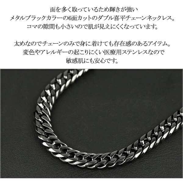 面を多く取っているため輝きが強い、メタルブラックカラーの6面カットのダブル喜平チェーンネックレス。