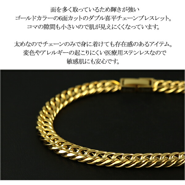 【Crazy Angel】サージカルステンレス ゴールドカラー 6面カットダブル喜平チェーン 幅6.5mm 20cm ブレスレット