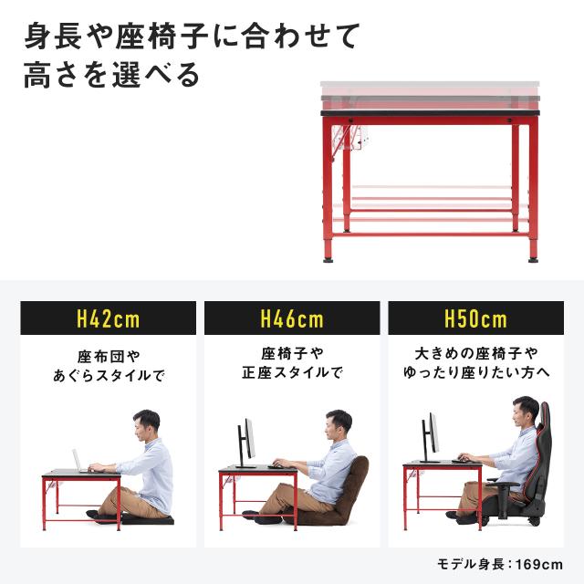 ⇒ご購入の前にご確認下さい床に座った姿勢でのゲームプレイに最適。幅100cm、奥行60cmのゲーミングローデスク。カーボン調ブラックの天板とレッドフレームがアクセントになったゲーミング仕様。体格や座る椅子に合わせて3段階の高さ調整ができる。【WEB限定商品】