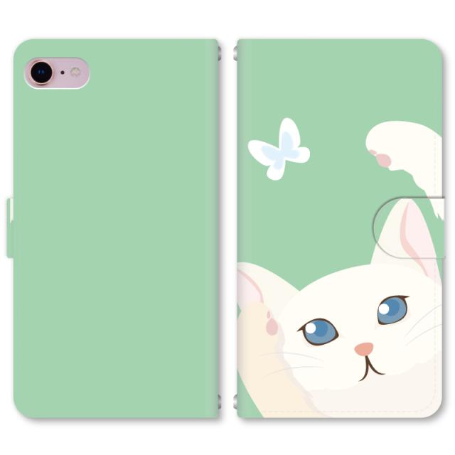 スマホケース 手帳型 iPhone13 iPhoneSE2 アイフォン 8 aquos sense GooglePixel xperia galaxyなど多機種制作対応 m277_猫アップ(グリーン)