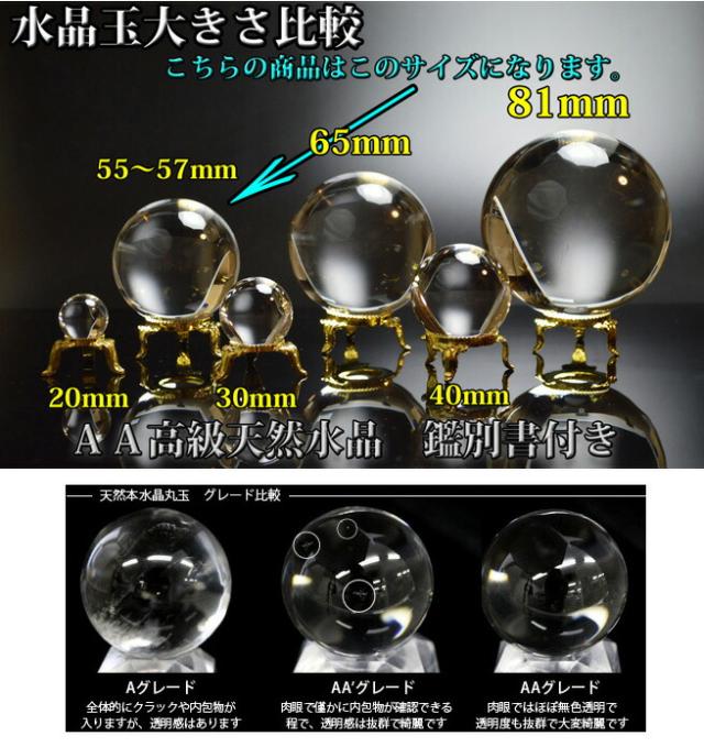 【送料無料】 55mm〜57mmミリ丸玉 天然本水晶玉AA 高級品◆宝石鑑別書&金の台座付き◆ 風水グッズ/天然石/パワーストーン 浄化/地鎮祭/全体運/ロッククリスタル/天然クオーツ/