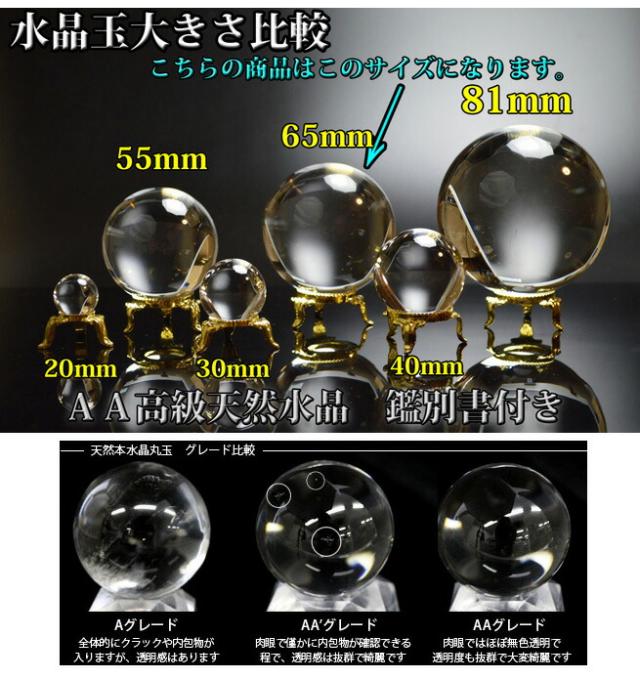 【送料無料】 65mmミリ丸玉 天然本水晶玉AA 高級品◆宝石鑑別書&台座付き◆ 風水グッズ/天然石/パワーストーン 浄化/地鎮祭/全体運/ロッククリスタル/天然クオーツ/