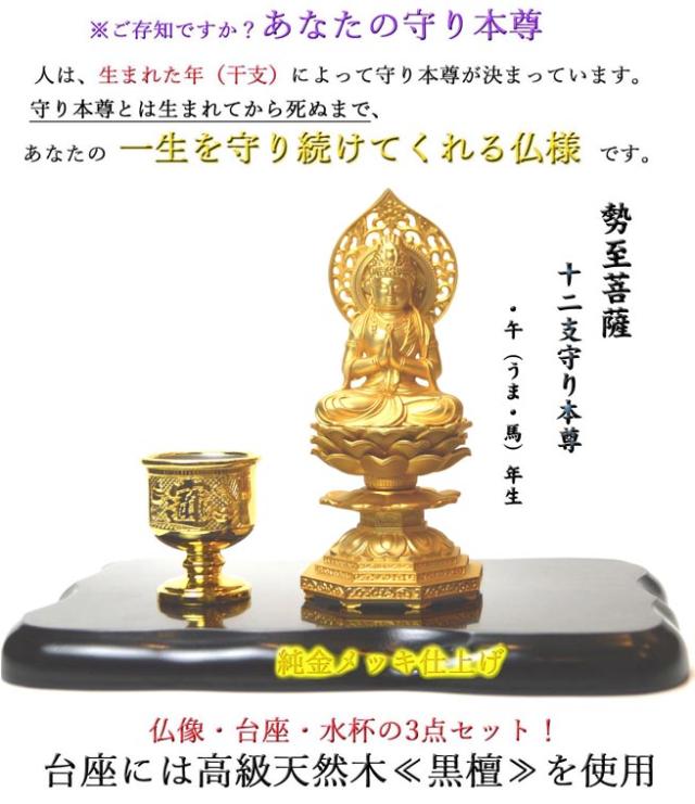 NO-5【送料無料】午(うま・馬)年生まれの守り本尊 風水の≪純金メッキ仏像≫■勢至菩薩(せいしぼさつ)■ 高級木黒檀の台座・水杯・仏像の3点セット! 八対仏/十二支守り本尊/風水グッズ/開運アイテム/仏像/水晶/風水の置きもの/護り本尊/新年/干支