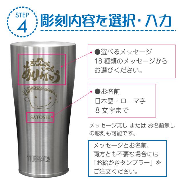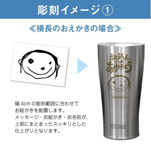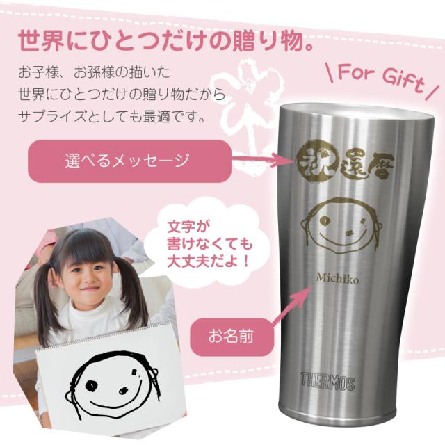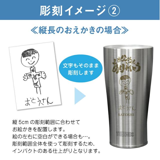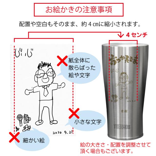 【 お名前彫刻 】 お絵かきの下には、贈る相手のお名前や、 お絵かきを描いたお子様のお名前を彫刻します。 当店自慢のレーザー加工による名入れサービスは、 職人の手でひとつひとつ丁寧に施しております。 彫刻したお名前は消える事がございませんので、 贈り物として大変喜ばれます。 「 どうして名前入りが喜ばれるの? 」 自分の名前が入った商品は世界にただ一つだけ。 贈った人に大事に使ってほしい、想いが伝わります。 さらにお名前彫刻はずっと消えずに残るから、 永く愛着を持って使っていただけます。 だから、「名入れギフト」は大切な人に感謝の気持ちを伝えるのにぴったりなおくりもの。 私たちは、みんなが笑顔になれる商品をお届けします。 [ 2. 安心のブランド サーモス ] 感動を手に取るたびに感じることが出来るから、 実用性のあるタンブラーならなお嬉しい。 - 保温・保冷効果抜群 - サーモスといえば、魔法びん のパイオニア! 真空断熱構造で造られたタンブラージョッキは、熱伝導が発生しにくく、 冷たいままを長時間キープしてくれます。 ぬるくならず、結露しにくいから、 いつでも冷た〜いビールが楽しめて、テーブルも濡らすことなくストレスフリー。 6時間経っても氷が溶けない驚異の保冷力で、 飲み物が氷で薄まることもありません。 ハイボールや酎ハイ、ソフトドリンクも美味しくいただけます。 - 食洗器OK - 食洗機対応なのでお手入れも簡単! その使い勝手の良さは、毎日の生活に欠かせない存在になること間違いなしです。 当店スタッフも声をそろえて「これを使ったら、今まで使っていたグラスには戻れない!」と言うほど、機能性に優れています。 [ 3. かんたん3ステップ注文!] 1)まずは お絵描き する 縦長の真っ白な紙に黒マジックではっきりと! 2)描いた お絵描き を撮影 絵を壁に貼り付けたら、スマホでパシャリ。 3)送信 ご注文後『写真送付先』よりお写真を送る 以上の3ステップ! 思い立ったらすぐに注文できちゃいます。 【 あんしん無料ラッピング 】 直送を除きラッピングはせず同梱してお届け。 だからお渡し前に彫刻内容をご確認いただけて安心。 [ 特製 桐箱入り ] 特製の桐箱に入ってさらに特別感UP! まるで宝箱みたいな桐箱は、 大切な物を保管するのにも最適です。 当店オリジナルの選べるメッセージシールもお付けいたします。 届いたらすぐに渡せるのが嬉しいポイント♪ [ こんな方におすすめ ] |