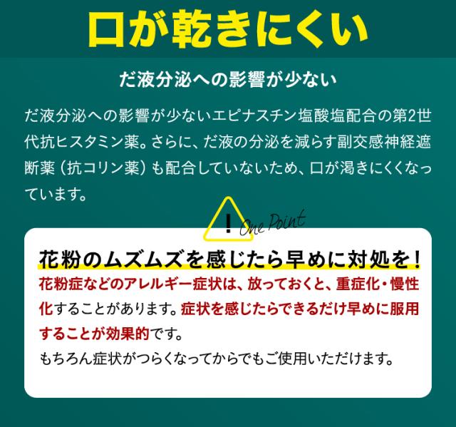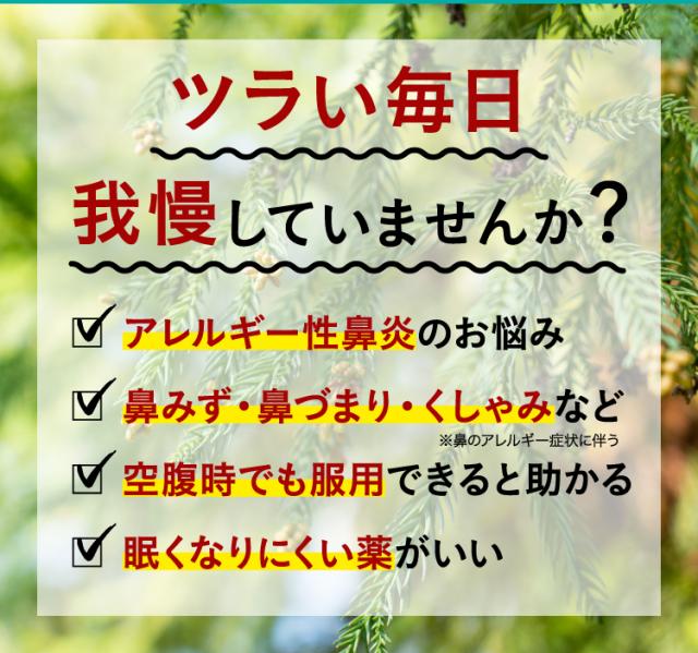 (2) 花粉などの季節性のアレルギー性鼻炎症状に使用する場合は、花粉飛散予測日から、又は、症状が出始めたら早めに服用を始めると効果的です。