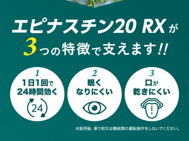 ◎ エピナスチン20 RXは、第2世代抗ヒスタミン成分であるエピナスチン塩酸塩を配合したお薬で、1日1回就寝前の服用でくしゃみ、鼻みず、鼻づまりのアレルギー性鼻炎の症状にすぐれた効果を発揮します。