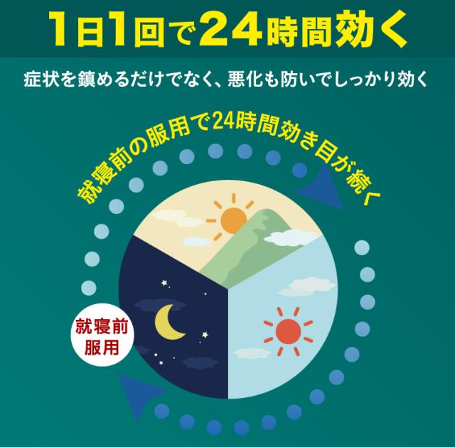 成人(15歳以上):1回量 1錠 / 1日1回、就寝前