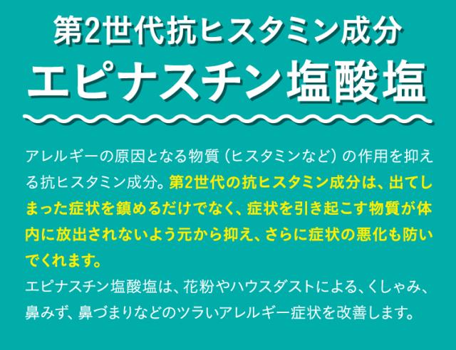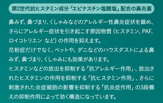◎ アレルギー性鼻炎の症状は、花粉・ハウスダストなどを吸い込んだ時に、アレルギーの原因物質であるヒスタミンなどが体内で放出されることで起こります。エピナスチン塩酸塩は原因物質の作用を阻害し、また、原因物質の放出も抑制することでアレルギー性鼻炎の症状にすぐれた効果を発揮します。