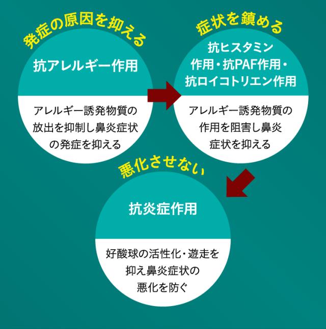 花粉、ハウスダスト(室内塵)などによる次のような鼻のアレルギー症状の緩和:くしゃみ、鼻みず、鼻づまり