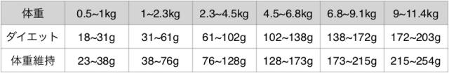 ・この給与量はあくまでも目安です。給与量は犬種、年齢、運動量、性別、季節等様々な要因によって変化しますので、パートナーの様子を見て調節してあげて下さい。