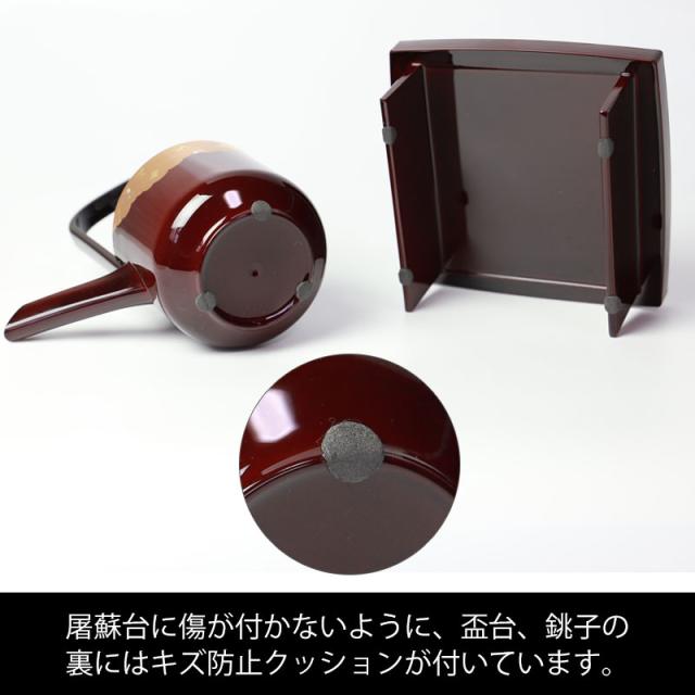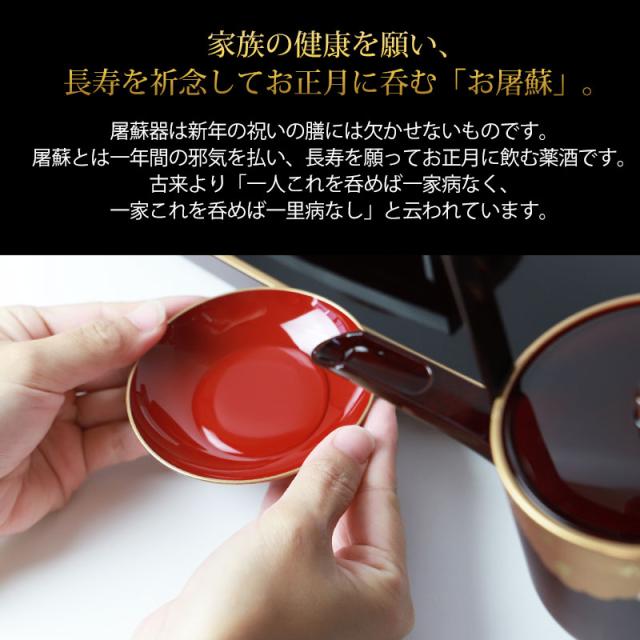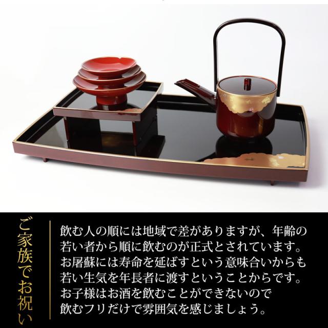 日本のお正月は一年で一番大切な日。その年の健康と家族の繁栄を願い新春を寿ぎ、お節やお雑煮などの特別なお料理でお祝いをします。屠蘇とは一年間の邪気を払い、長寿を願ってお正月に飲む薬酒です。古来より「一人これを呑めば一家病なく、一家これを呑めば一里病なし」と云われています。家族の健康を願い、長寿を祈念してお正月に呑む「お屠蘇」。上質な屠蘇器セットで呑むことでお正月の雰囲気がぐっと盛り上がります。素材は漆器用樹脂にウレタン塗装の仕上げで、気軽に使っていただけますので、毎年活躍するでしょう。飲む人の順には地域で差がありますが、年齢の若い者から順に飲むのが正式とされています。お屠蘇には寿命を延ばすという意味合いからも若い生気を年長者に渡すということからです。お子様はお酒を飲むことができないので飲むフリだけで雰囲気を感じましょう。■品番to-10■サイズ(約)屠蘇台:39.5×22.5×3.2cm盃台:13×13×5.2cm銚子:15×8.5×16.5cm盃大:直径11×3.7cm盃中:直径9×高さ3cm盃小:直径7.7×2.4cm■素材ABS樹脂(プラスチック)、フェノール樹脂■塗装の種類ウレタン塗装■生産国日本製
