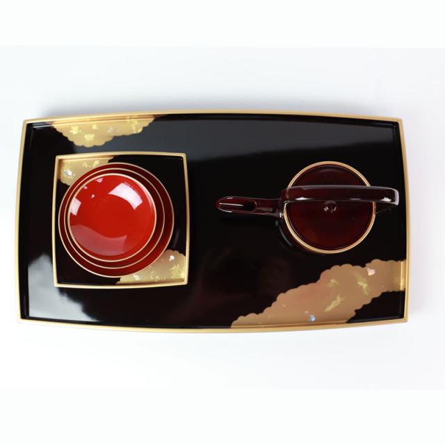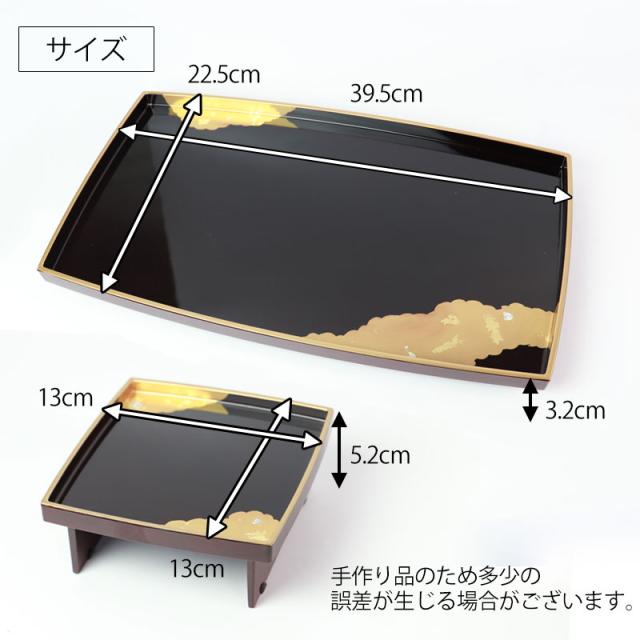 | サイズ(約) | 屠蘇台:39.5×22.5×3.2cm 盃台:13×13×5.2cm 銚子:15×8.5×16.5cm 盃大:直径11×3.7cm 盃中:直径9×高さ3cm 盃小:直径7.7×2.4cm |