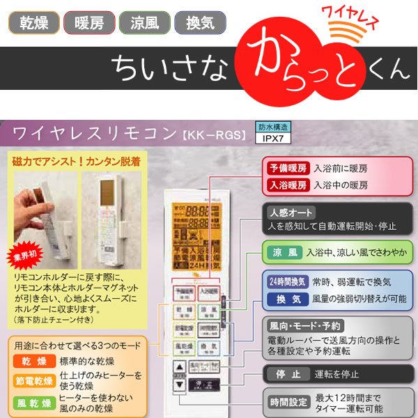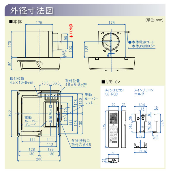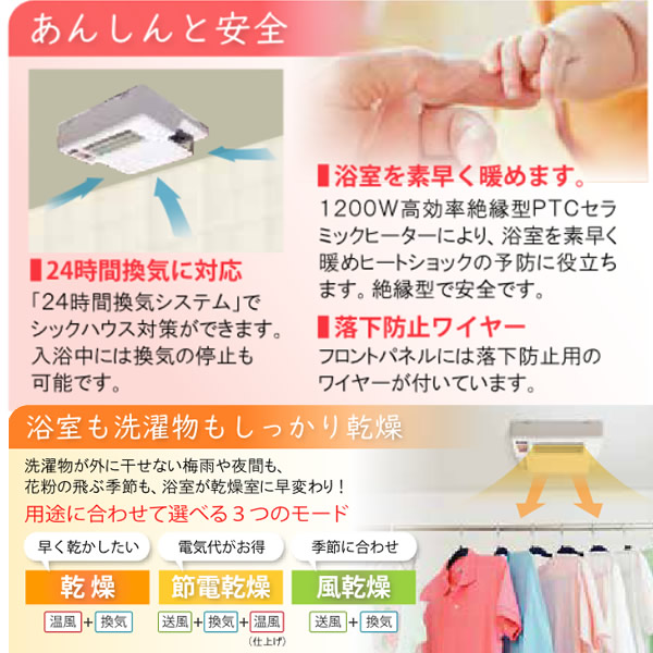 ■AC100V ■天井取付 ■24時間換気対応 ■搭載ヒーター:絶縁型PTCセラミックヒーター(1200W) ■開口寸法:180×180mm(175〜240×175〜240mmまで対応) ■適合パイプ:φ100mm ■ワイヤレスリモコン:KK-RGS ※記載は商品仕様の一部です。仕様説明不足等の理由での返品はできません。特に適合等は必ずご確認ください。