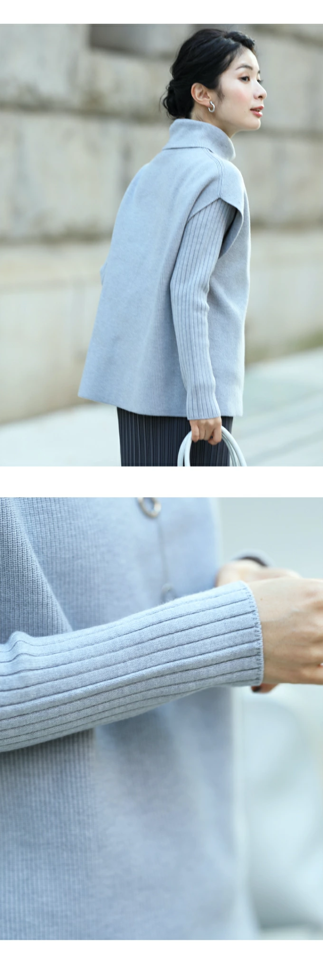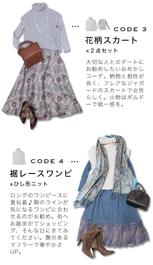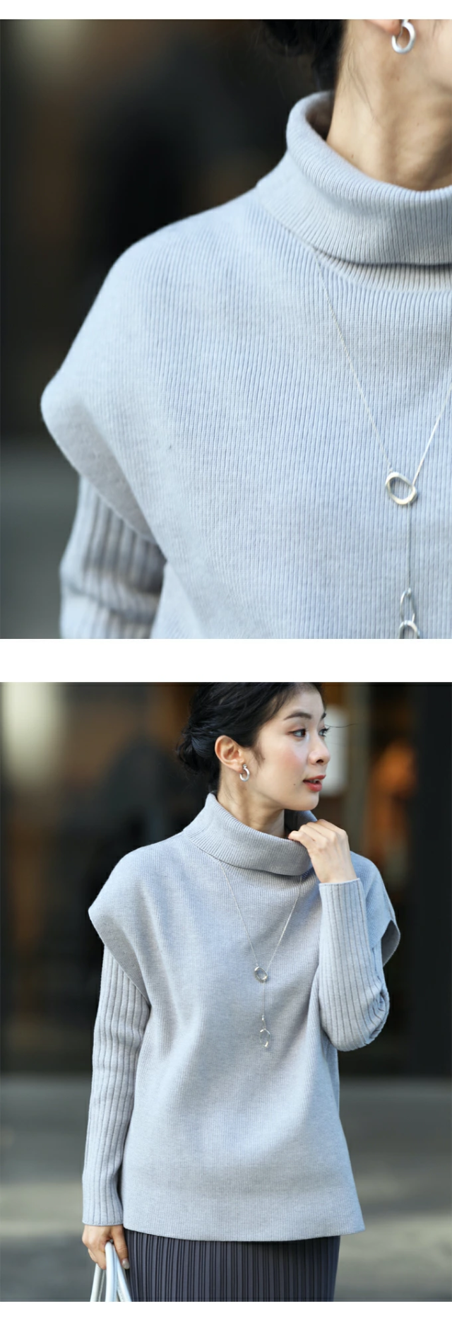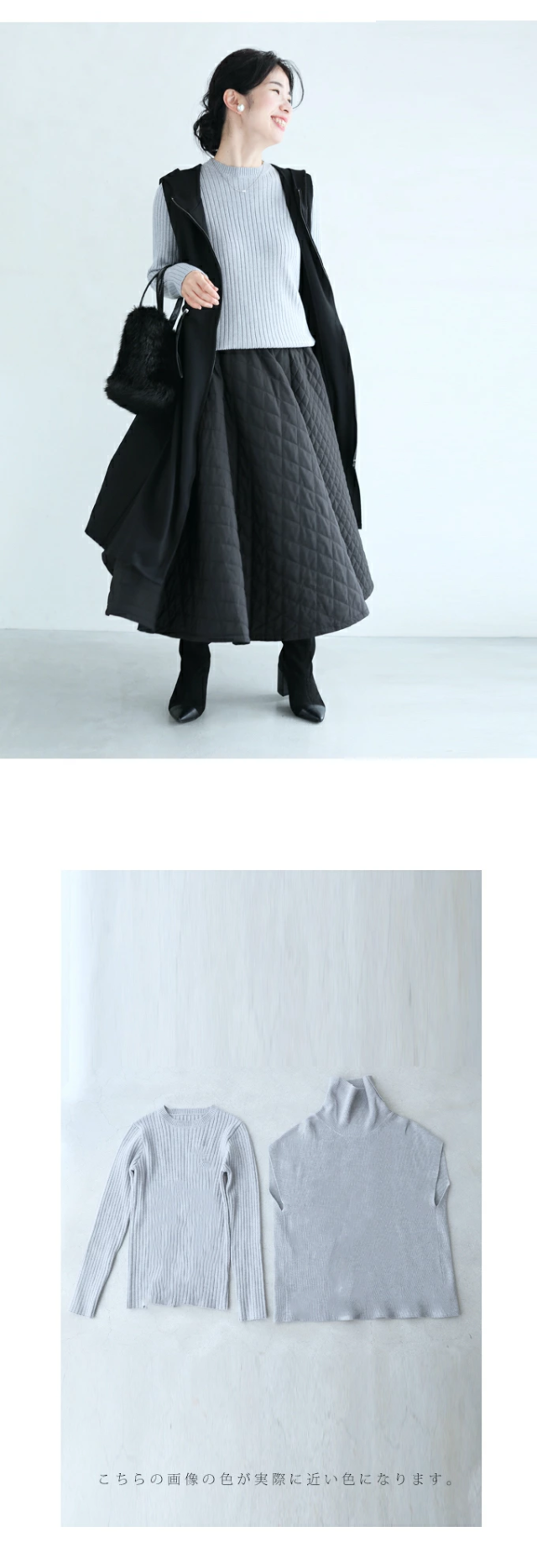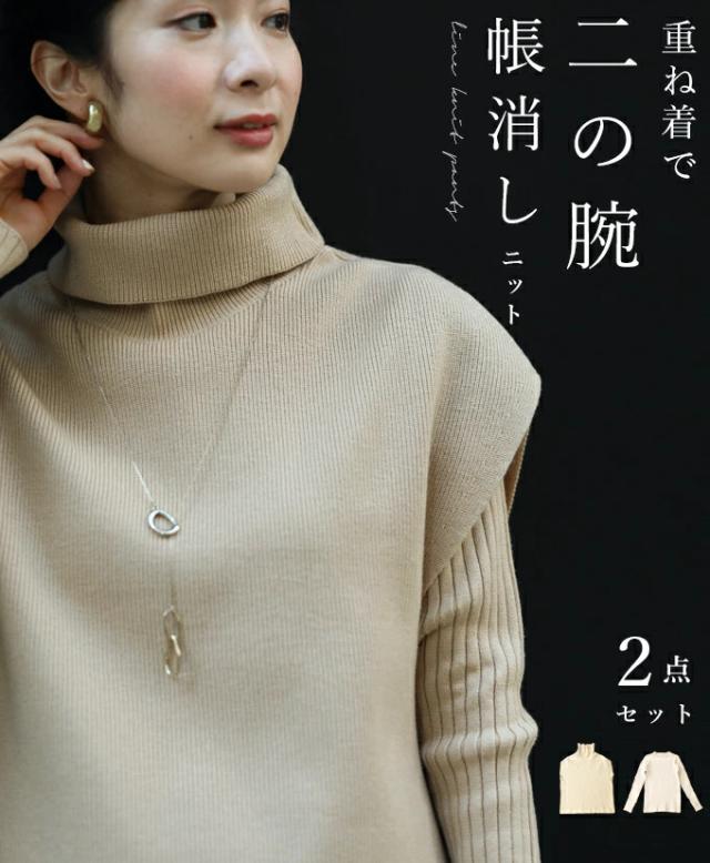 ゆったりのタートルと細見えリブニットの2点セット。