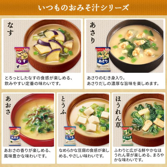 ■ いつものおみそ汁 なす 9.5g あさり 7.4g あおさ 8.2g とうふ 10g ほうれん草 7g 小松菜 8.3g 長ねぎ 9g 野菜 10g 里いも 9g とん汁 10.5g なめこ 赤だし 8g ■ いつものおみそ汁 贅沢 焼なす 9.1g 海苔 7.5g とうふ 10.5g 炒め野菜 11g 豚汁 12.5g なめこ 9g しじみ 赤だし 15g ■ 減塩 いつものおみそ汁 減塩なす 9g 減塩あさり 7.5g 減塩とうふ 10.3g 減塩ほうれん草 6.8g 減塩長ねぎ 8.5g 減塩野菜 10.1g 減塩なめこ 赤だし 8g 減塩赤だし 三つ葉入り 8g ■ 旨だし おみそ汁 なす汁 合わせ 9g こまつ菜 合わせ 9g 豚汁 12.5g なめこ 合わせ 8g なめこ 赤だし 8g 31種 各3食 合計93食 |