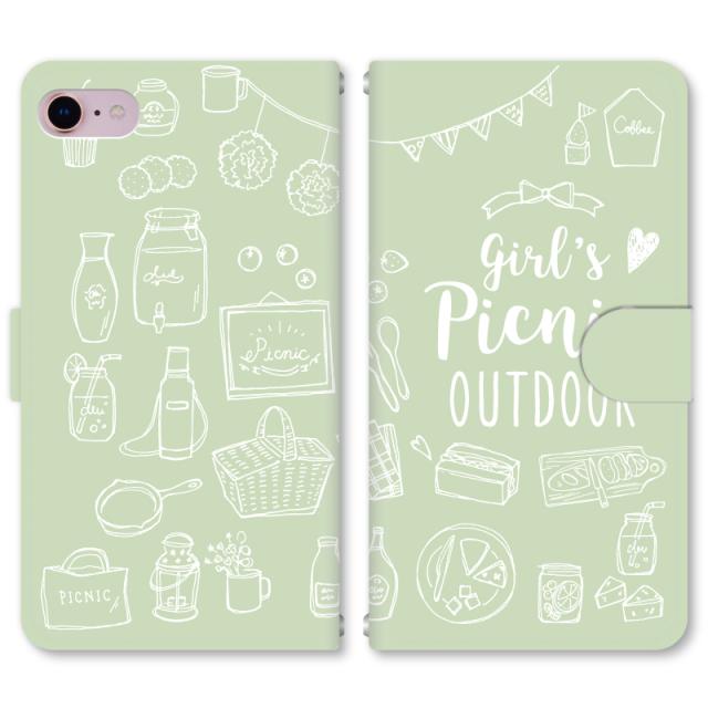 スマホケース 手帳型 iPhone13 iPhoneSE2 アイフォン 8 aquos sense GooglePixel xperia galaxyなど多機種制作対応 m411_ピクニック[グリーン]