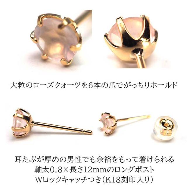 メンズピアス 片耳 18金 18K ローズクォーツ 大粒 5mm 特針 日本製 【品質保証書つき】シンプル セカンドピアス つけっぱなし 誕生石 パワーストーン