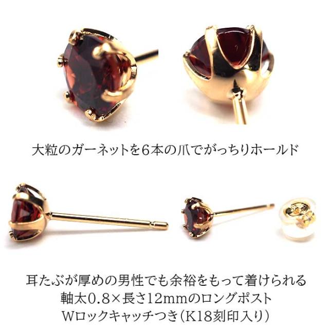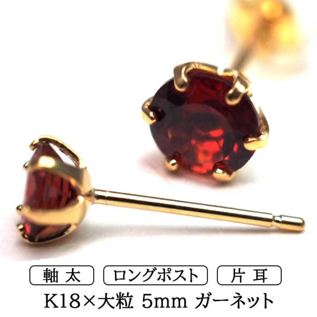 メンズピアス 片耳 18金 18K ガーネット 大粒 5mm 特針 日本製 【品質保証書つき】シンプル セカンドピアス つけっぱなし 誕生石 パワーストーン
