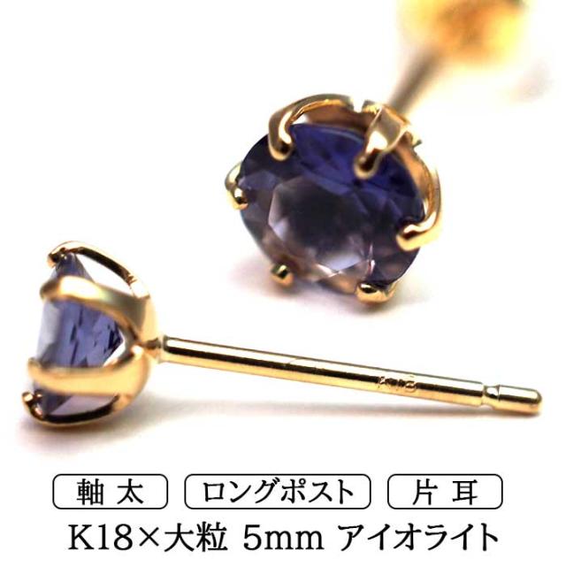 メンズピアス 片耳 18金 18K アイオライト 大粒 5mm 特針 日本製 【品質保証書つき】シンプル セカンドピアス つけっぱなし 誕生石 パワーストーン
