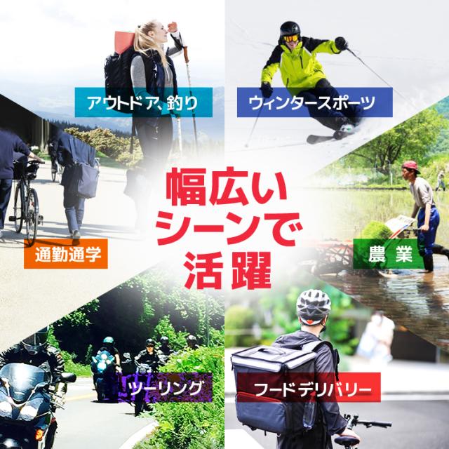 登山やウィンタースポーツはもちろん、釣り、サイクリング、バイクツーリング、農作業、またフードデリバリーなど幅広いシーンで活躍します。