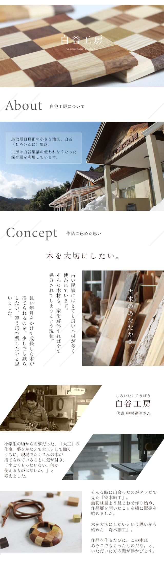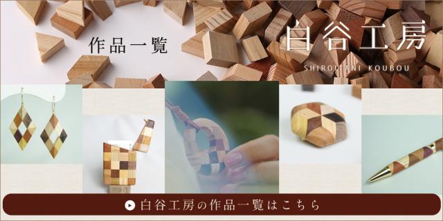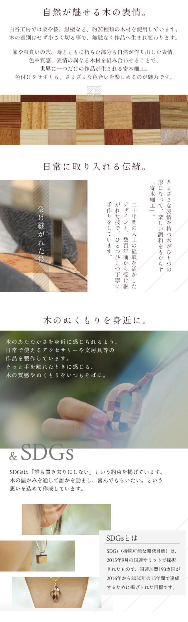木々のぬくもりを、いつもそばに——。独特の世界観を持つ寄木細工のアクセサリー工房「白谷工房(しろいたにこうぼう)」。鳥取県の中国山地にある小さな集落で生まれた、サスティナブルな「SDGsアクセサリー」をお届けします。作品に使用する木材は、古い民家を解体した木や建築現場の端材。長年風雪に耐えてきた木々は切りたての木とは違った風合いがあり、作品をより個性的に魅せてくれます。木を大切にしたいという思いから、大工の意匠を活かしたデザインと技で、ひとつひとつ丁寧に手作りをしています。