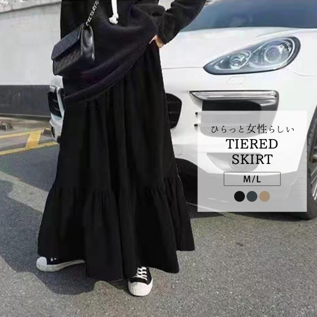 春新作 レディース ロング スカート 秋冬 黒 シンプル 無地 ゆったり ティアードスカート 裾 切り替え ギャザー マキシスカート フレアスカート きれいめ 可愛い お洒落 普段着 着回し OL 通勤 ママ オフィス お出かけ デート 定番 ベーシック ロンスカ