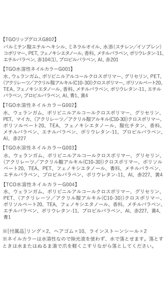 | 注意点 | [対象年齢]6歳以上 ※これは子供用化粧品です。 ※必ず、保護者の監視のもとでご使用ください。 【注意】(保護者の方へ 必ずお読みください) ※アトピーやアレルギーなどの症状が認められたり、お肌の弱いお子様は絶対に使用しないでください。 ※お肌に異常が生じていないかよく注意して使用してください。化粧品がお肌に合わないとき即ち次のような場合には、使用を中止してください。そのまま化粧品類の使用を続けますと、症状を悪化させることがありますので、皮膚科専門医等にご相談されることをおすすめします。 1.使用中、赤味、はれ、かゆみ、刺激、色抜け(白斑等)や黒ずみ等の異常があらわれた場合 2.使用したお肌に、直射日光があたって上記のような異常があらわれた場合 ※目に入らないようにご注意ください。目に入った場合はすぐに水またはぬるま湯で洗い流してください。 ※アクセサリー、シール、リング、ブラシ、チップなど小さい部品があります。口の中には絶対入れないでください。 ※メイクアップ類は長時間つけたままにせず、遊び終わった後やお休み前には必ず洗い流してください。 ※誤飲などの危険がありますので、使用後は必ず3歳未満のお子様の手に触れないところに保管してください。 ※砂損・変形した場合にはご使用をお止めください。 ※ゴムを指などに巻きつけたりしないでください。血が通わなくなり危険です。 ※ご使用後は必ずキャップをしっかり閉めてください。 ※衣服につかないようにご注意ください。衣服についた場合は、直ちに洗剤などで洗い落としてください。 ※直射日光の当たる所には置かないでください。 ※高温(40度以上)や、高湿度の所には置かないでください。 ※高温多湿等の環境下で、油分が水滴のような状態になって表面ににじみ出ることがありますが、品質は問題ありません。 ※カメラやモニターの性質により、画像と実物の色の違いがある場合がございますのでご理解願います。 |